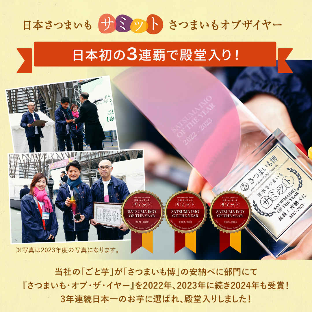 ごと芋が極甘な理由(わけ)は、収穫されたさつまいもはすぐに焼かず、温度・湿度・通気が管理された暗室の貯蔵倉庫でじっくり寝かせることで甘みが増します。そして長年焼き芋を焼き続けてきた熟練の職人が一つひとつ丁寧に焼き具合を見ながら一定の温度でじっくり焼くことでぐんぐん甘くなっていき、鮮やかな黄金色をした極甘な焼き芋ができあがります。