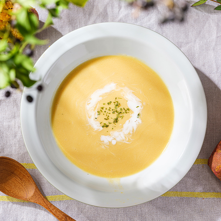 約30年間和食やイタリアンなど幅広いジャンルの料理を得意としてきたシェフが開発を担当し、さつまいもそのものの美味しさを最大限にいかしました。美味しさがぎゅっと詰まったやさしい甘口のポタージュ。とろりとした食感とさつまいもの風味を楽しめます。