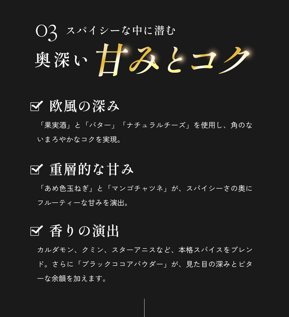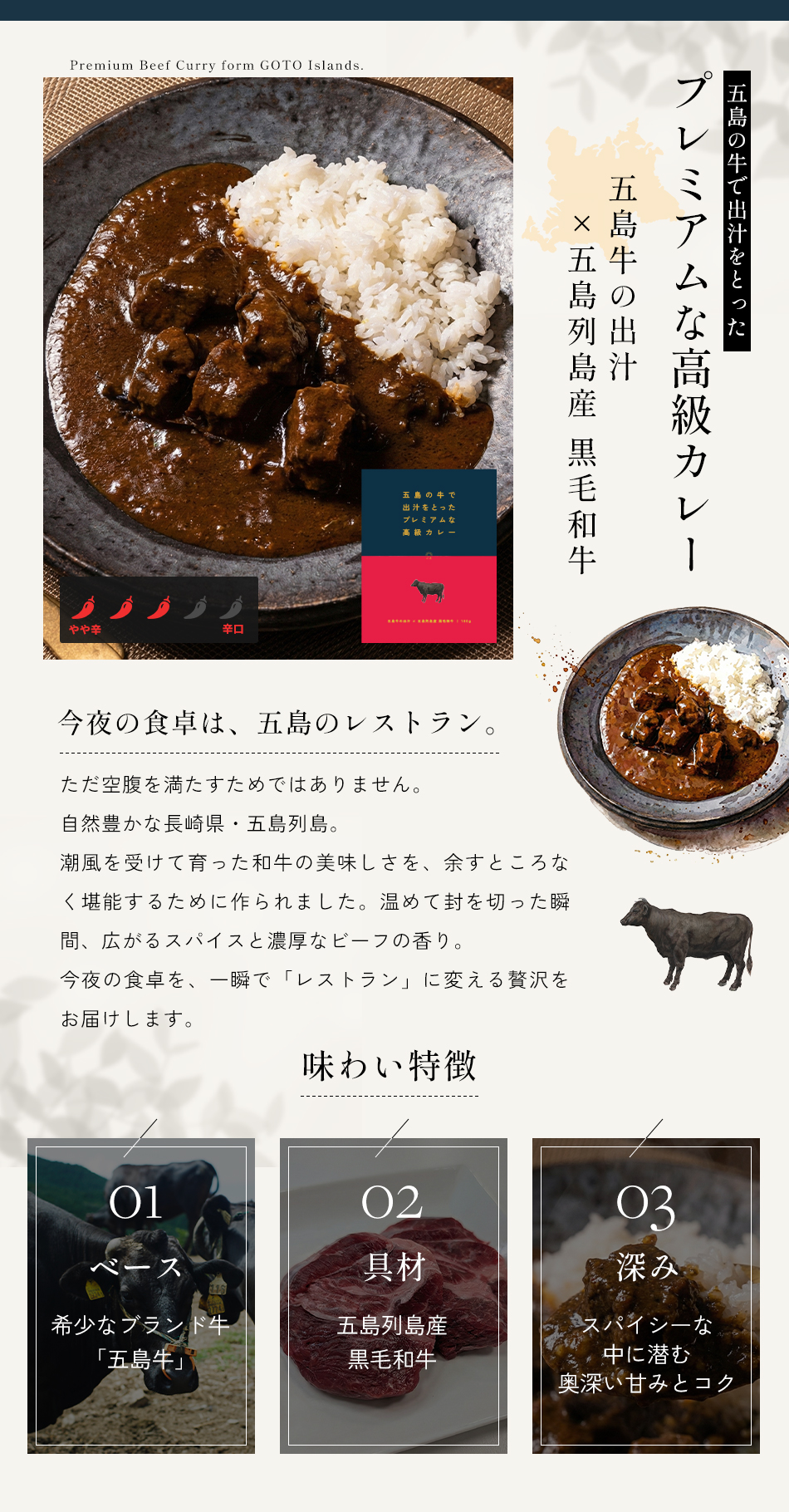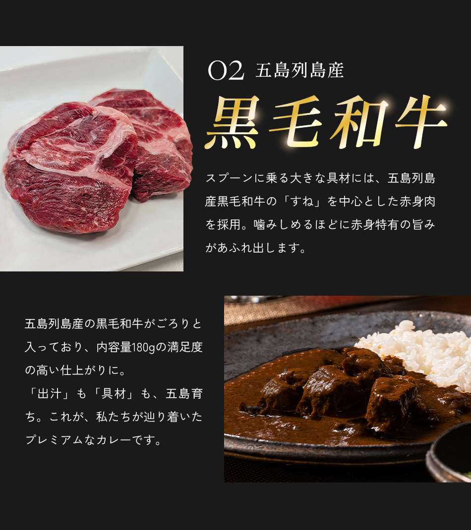 | 原材料名 | 牛肉(長崎県五島列島産、五島牛10%)、玉ねぎ、牛骨、食用なたね油、人参、有機トマト・ジュースづけ、トマトピューレー、にんにく、牛乳、果実酒、ブイヨン、コリアンダー、バター、ナチュラルチーズ、カルダモン、カシューナッツパウダー、クミン、シナモン、スターアニス、マンゴチャツネ、ブラックココアパウダー、食塩、フェネグリーク、ブラックペッパー、ナツメグ、クローブ、カエンペッパー、昆布、(一部に乳成分・カシューナッツ・牛肉を含む) |