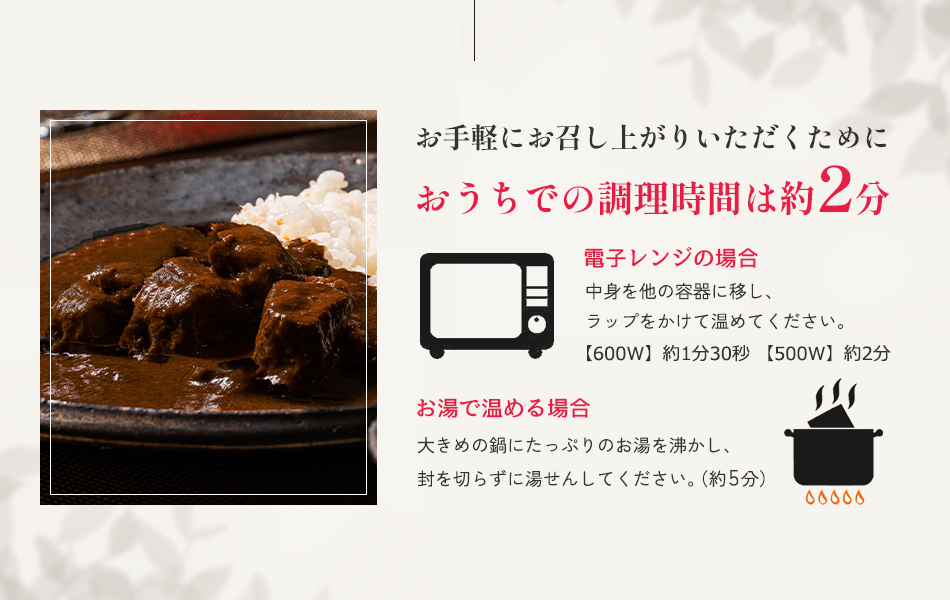 | お召し上がり方 | 湯せんの場:沸騰してから袋のまま約3~5分 電子レンジの場合:袋から出して、500Wで約2分半 あぶらが浮いていることがありますが、五島牛の良質なあぶらです。 より一層うまみが増すので、ルーと混ぜてお召し上がりください。 |