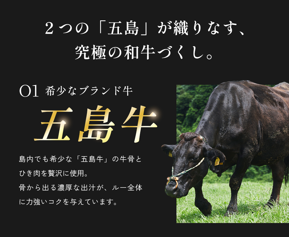 自然豊かな長崎県・五島列島で育った和牛のおいしさを存分に堪能できる、贅沢な味わいのビーフカレー。ごろりと大きな具材は五島列島産黒毛和牛のすねを中心とした赤身の部位を、またルーのベースにはさらに希少な“五島牛”のみを使用。“五島牛”の牛骨でとった出汁や溶け込むひき肉のうまみが合わさっています。五島のめぐみがつまった、まさに「和牛づくし」の一品です。